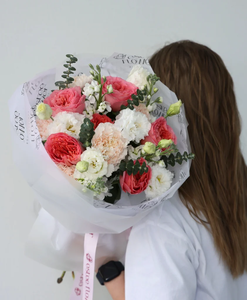 Capri Bouquet features garden roses, stock, lisianthus, and eucalyptus in a fresh, airy mix. Garden roses create the main shape with ruffled petals and a soft rose fragrance. Stock adds height and clustered blooms with a clean, spicy-floral scent. Lisianthus brings smooth, delicate petals and a refined, light floral aroma, while eucalyptus adds a crisp green finish. Capri Bouquet fits birthdays, anniversaries, weddings, Mother’s Day, and “thinking of you” gifts. Available sizes: XS, S, M, L, and XL.