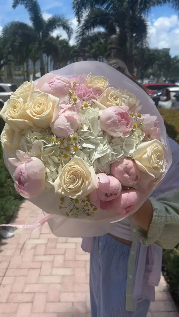 Creamy Milkshake mixed bouquet feels airy and tender, with layered blooms and soft movement in every angle. Hydrangeas and peonies create a plush silhouette, while garden roses and chamomiles add detail and contrast. This flower mix suits romantic gestures and elegant celebrations, especially when you want something light yet expressive. We offer same-day delivery in Miami.