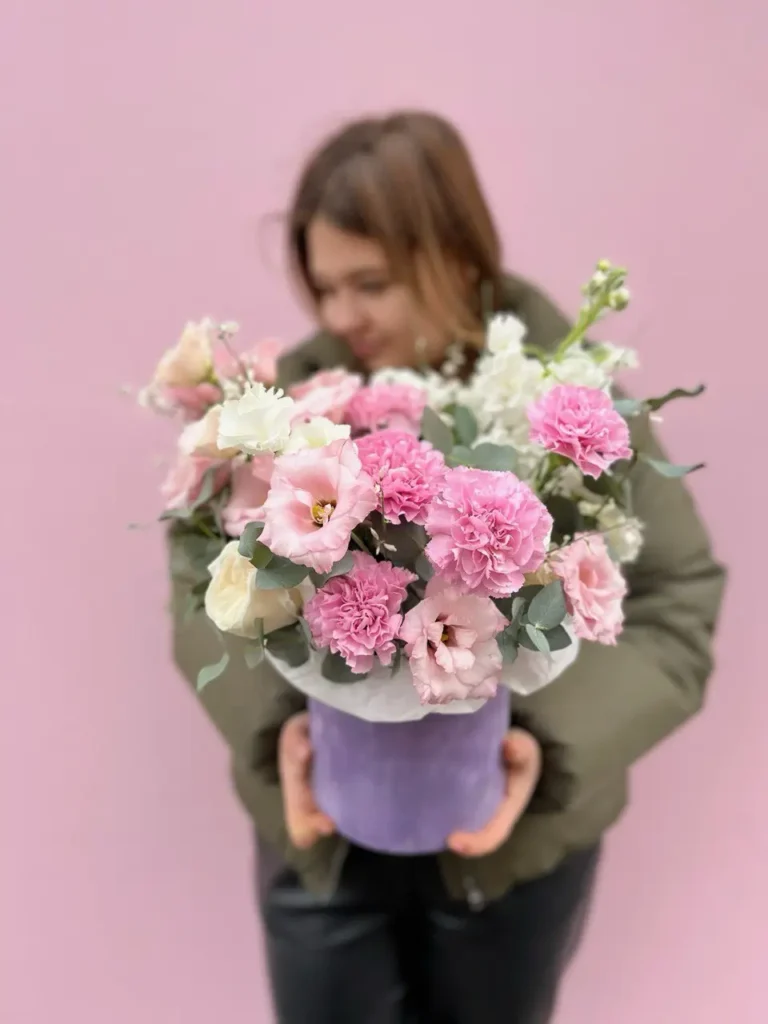 Flowers in a hat box 1 combine pink and pastel premium flowers in a structured round silhouette. Petals create a soft gradient from blush tones to lighter pastel shades, giving the composition smooth visual flow. The compact shape keeps every bloom visible from every angle while preserving balance and proportion. This pink pastel arrangement conveys warmth, care, and refined taste. We offer same-day delivery in Miami.