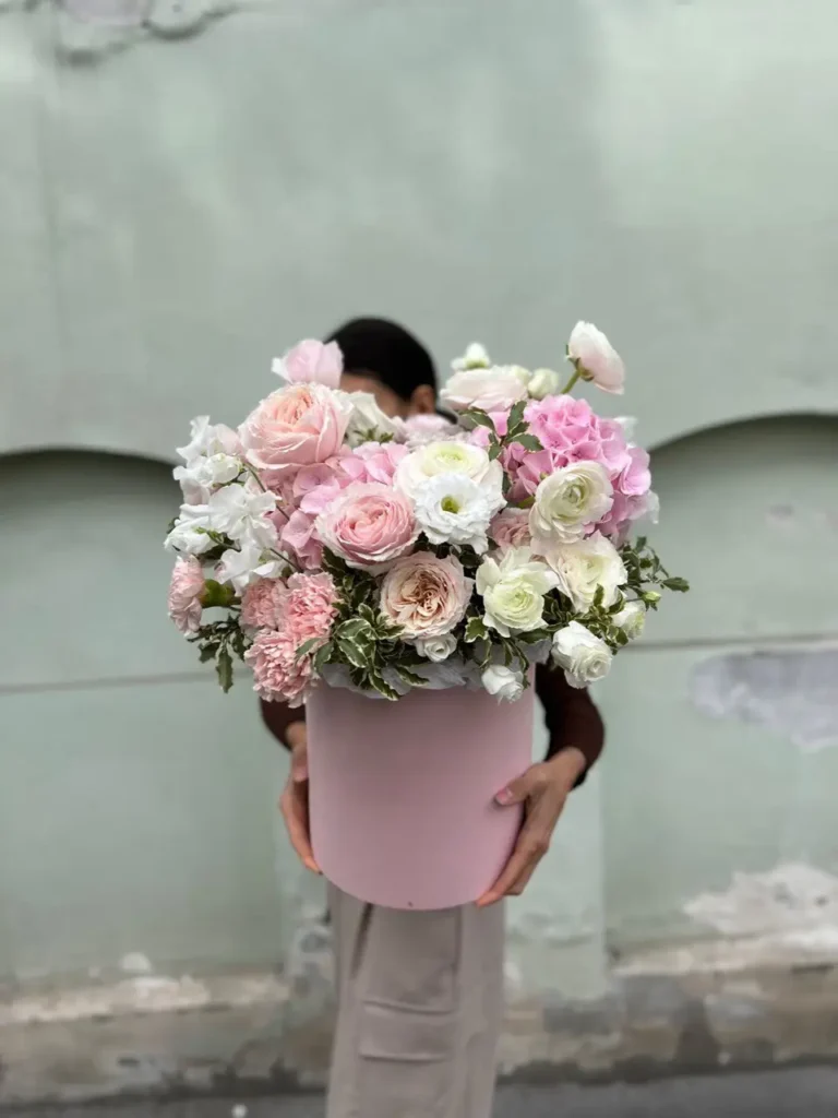 Flowers in a hat box features premium roses, hydrangea, lisianthus, ranunculuses, carnations, and seasonal flowers in a soft, elegant palette. Hydrangea adds airy volume, while premium roses keep the shape clean and balanced. Ranunculuses bring layered petals, and lisianthus adds a light, smooth finish. Flowers in a hat box is available in sizes S, M, L, and XL for a gift, a dinner table, or a larger celebration. This hat box flower arrangement fits birthdays, anniversaries, Mother’s Day, bridal showers, and “thinking of you” moments. Keep the arrangement in the hat box and add a little fresh water to the floral foam every 1–2 days.