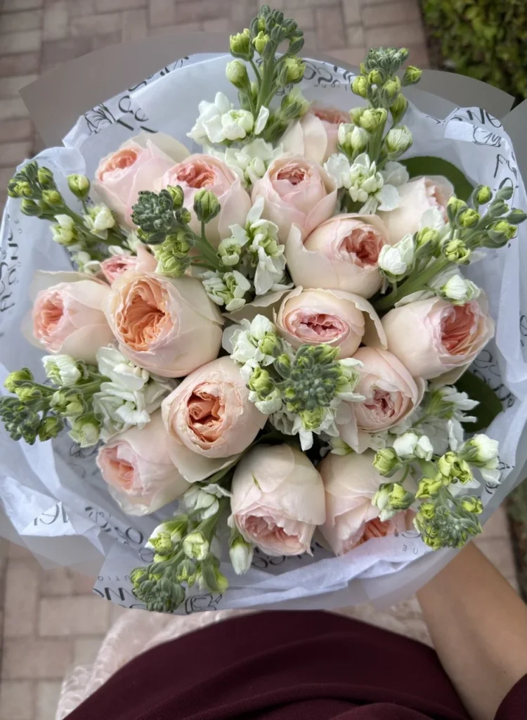 Juliet garden roses bouquet features peach Juliet roses paired with fragrant white stock. Juliet roses open into large cupped blooms with dense petals and a soft peach glow. White stock adds airy height and a sweet floral scent that fills the room. The bouquet looks romantic and polished, with warm peach tones balanced by clean white accents. This Juliet garden roses bouquet suits weddings, anniversaries, engagements, Valentine’s Day, and elegant “thinking of you” moments. Available in sizes 12, 25, 35, and 51.