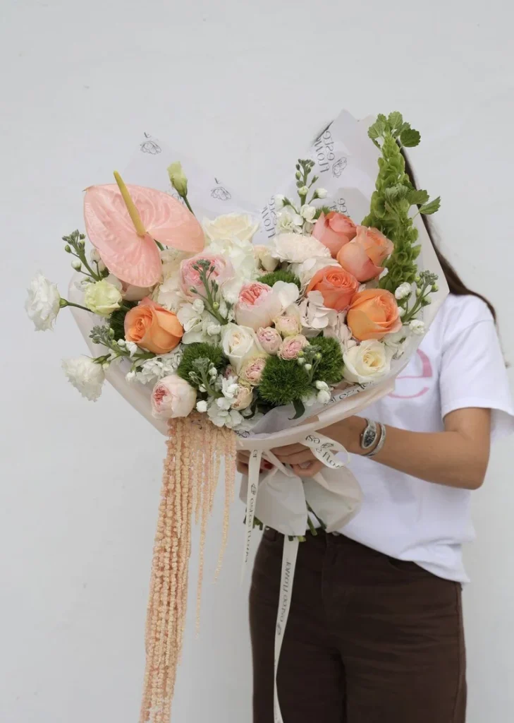The bouquet features a balanced mix of premium blooms, including hydrangeas, Bells of Ireland, garden roses, spray roses, lisianthus, anthuriums, white stock, dried hanging amaranthus, and premium roses. Each bouquet is handcrafted and wrapped in premium paper, making it gift-ready for your Seder host or a beautiful touch for your holiday home.