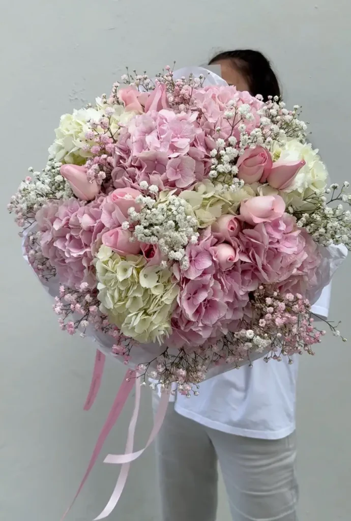 Mix with Hydrangea and Baby’s Breath Bouquet blends lush hydrangeas, premium roses, and soft baby’s breath into one full, airy arrangement. Hydrangea blooms bring rounded volume and a cloud-like shape, while roses add structured petals and a classic floral scent. Baby’s breath gives a light finish and a delicate, fresh aroma. This hydrangea and rose bouquet works for birthdays, anniversaries, engagements, weddings, and Mother’s Day. Choose size M, L, or XL for the right scale and impact.
