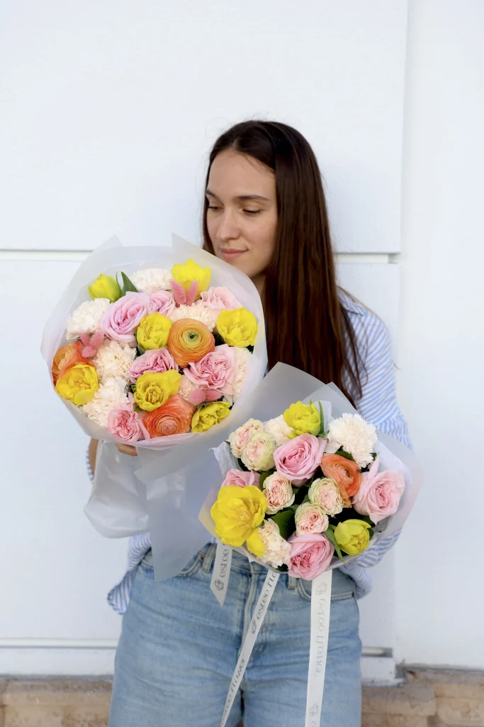 Matching bouquets for mom and daughter feature vibrant spring blooms elegantly wrapped in premium paper.