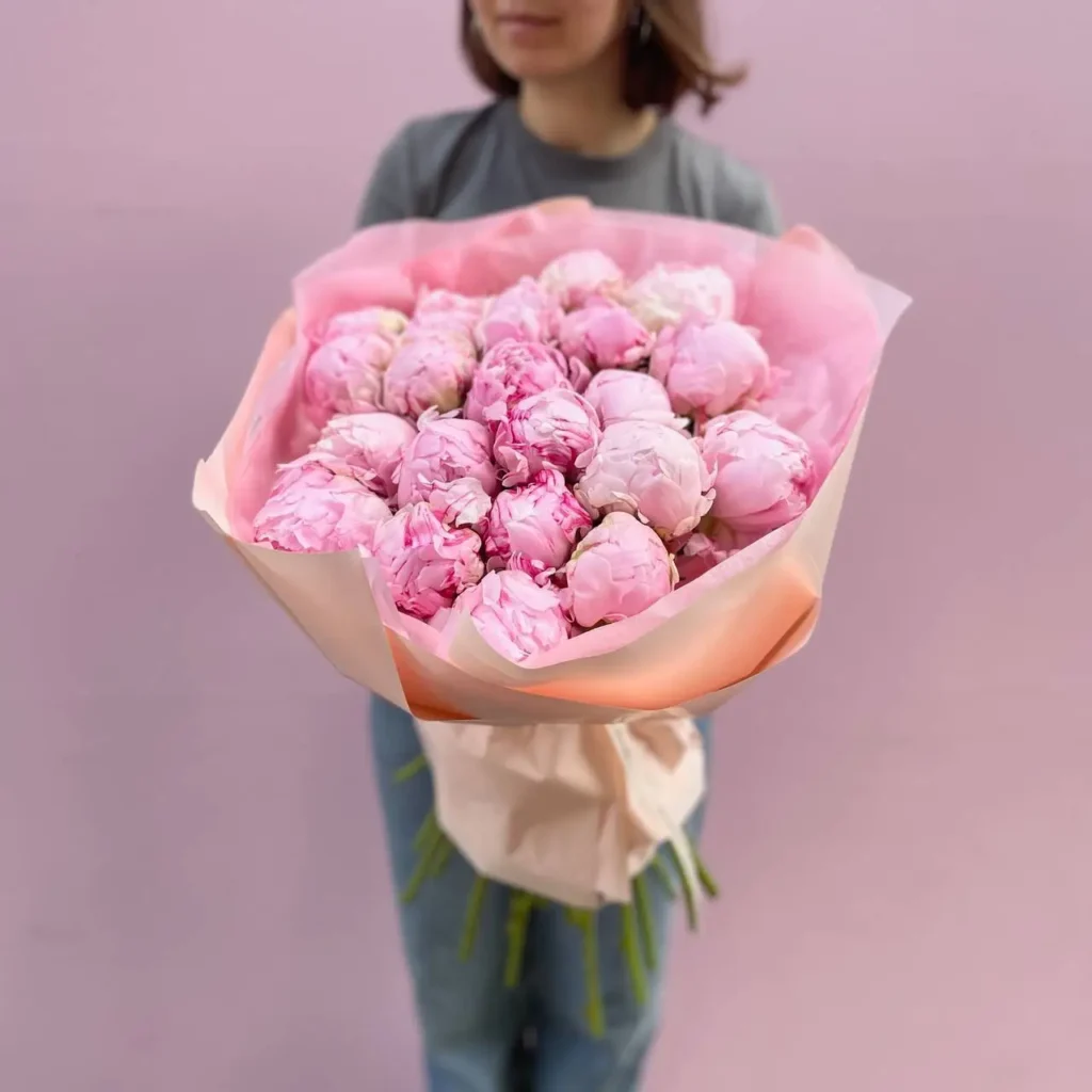 Pink Peonies Bouquet features light pink peonies with full, ruffled petals and a soft, natural fragrance. Each bloom opens into a lush, rounded shape, giving the bouquet a clean and classic look. The light pink tone feels romantic and refined, with a fresh seasonal finish. This peony bouquet suits birthdays, anniversaries, weddings, Mother’s Day, and elegant “thinking of you” gifts. Available sizes: 9, 15, 25, 35, 51, 101 peonies. The bouquets in the pictures consist of 21 and 101 peonies.