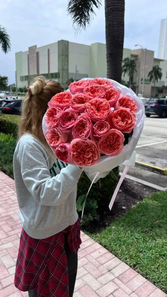 Pink Xpression garden roses stand out with ruffled petals and a full, rounded bloom shape. The color reads as soft pink with subtle depth toward the center, which adds dimension in photos and in person. This bouquet feels romantic and calm, with a modern, refined look that fits both celebrations and quiet moments. We offer same-day delivery in Miami.