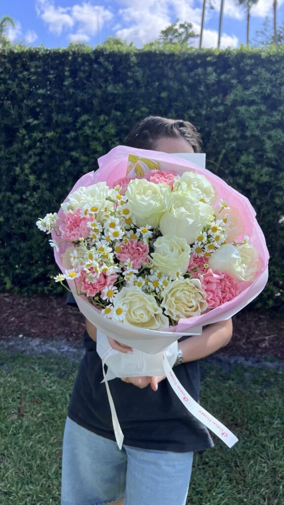 Sunny Morning Bouquet feels light and cheerful, built around fragrant roses, bright chamomiles, and curly carnations with soft ruffled edges. The mix creates a balanced shape with a natural, airy look. Chamomiles often symbolize comfort and warmth, while roses add tenderness and intention. We offer same-day delivery in Miami.