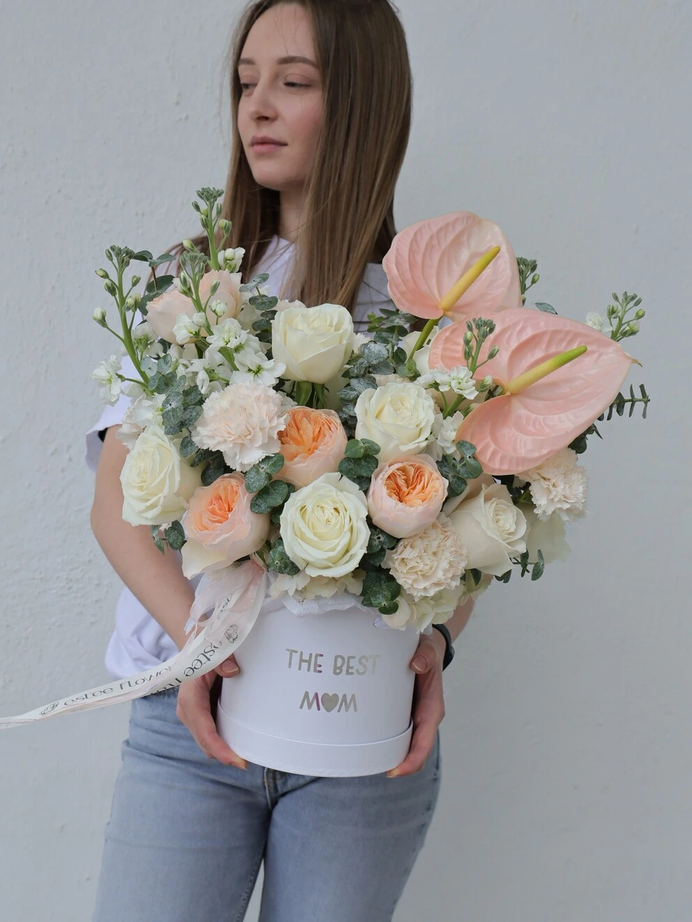 Premium flowers in white, green, blush, and peach shades in a signature ‘The Best Mom’ hat box. Flowers in a hat box focuses on harmony between form, texture, and restrained color contrast.