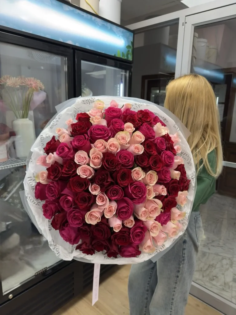 Three-Color Rose Bouquet “Eternal Passion” blends red, hot pink, and light pink premium roses in one bold mix. The bouquet features classic rose blooms with layered petals and a rich, fresh rose scent. Color contrast feels bright and expressive, with deep red tones balanced by vibrant pink and soft blush petals. Roses are wrapped in luxury floral paper for a clean, gift-ready finish. This three-color rose bouquet fits birthdays, anniversaries, Valentine’s Day, Mother’s Day, and “thinking of you” moments.